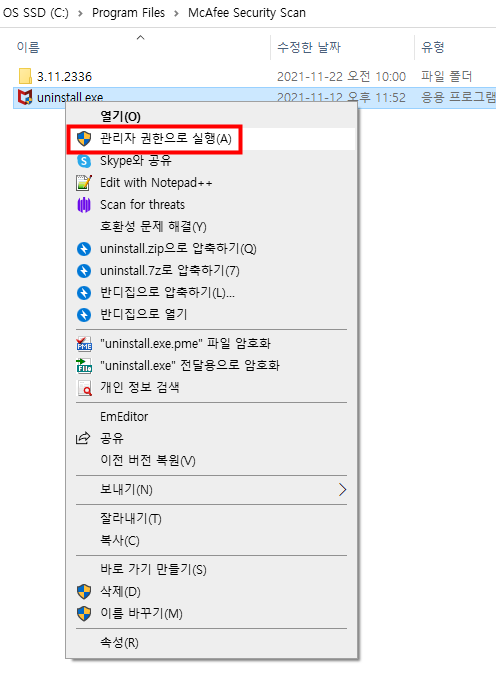 관리자가 아닌 윈도우 계정으로 삭제를 시도하는 경우 안 될 수도 있기 때문입니다. 그래서 관리자 권한으로 실행을 시도해봅니다.
