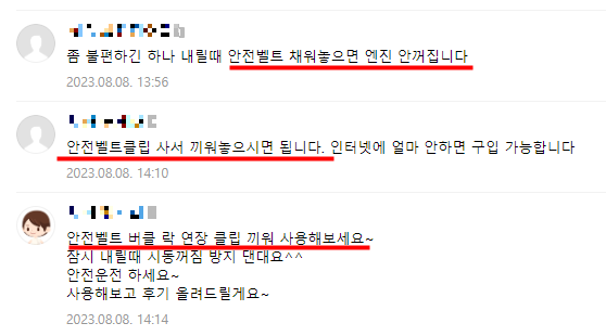 그런데 잠깐 내릴때마다 안전벨트를 이렇게 채우는 것도 매번 번거로울겁니다. 그럴 때는 안전벨트 연장 클립을 활용하면 좋은데요. 연장클립이 채워져 있으면 차량 시스템에서는 안전벨트가 채워져 있다고 판단하여 시동이 꺼지지 않고 운전자는 번거롭지 않을 수 있습니다.