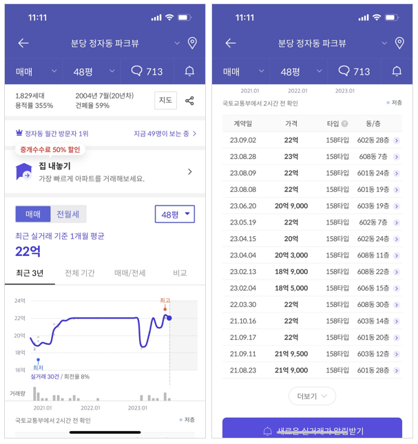 네이버 부동산처럼 상단에는 그래프 형태로 이해하기 쉽게 구성이 되어 있구요. 아래로 내리면 세세한 실거래 사례들을 조회할 수 있습니다.