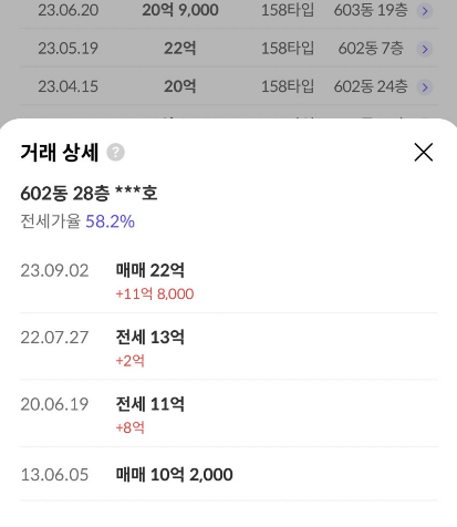 아래 화면처럼 몇동 몇호를 조회하면 과거 수년간 매매와 전세 사례들을 한번에 시간순으로 볼 수 있습니다.