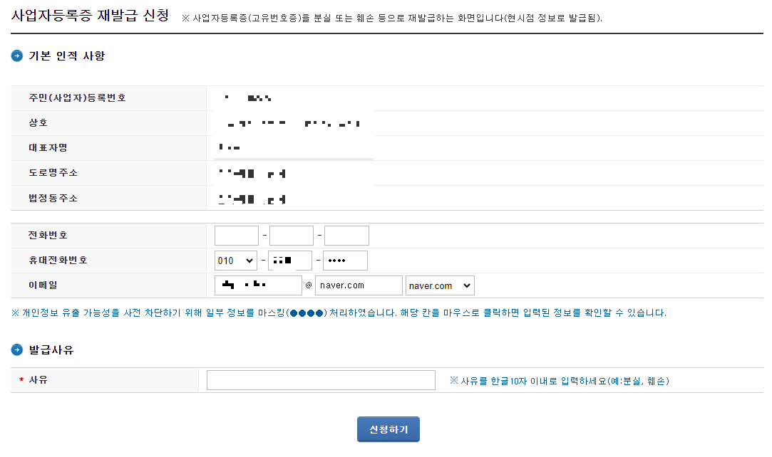 그러면 다음 화면에서 사업자등록증 재발급 신청을 위한 기본정보들을 입력합니다.