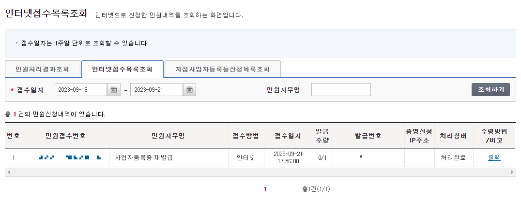 목록에 방금 내가 신청한 내역이 하나 나타날테고 맨 오른쪽에 '출력' 을 클릭하면 바로 사업자등록증을 인쇄하는 화면으로 넘어갑니다.