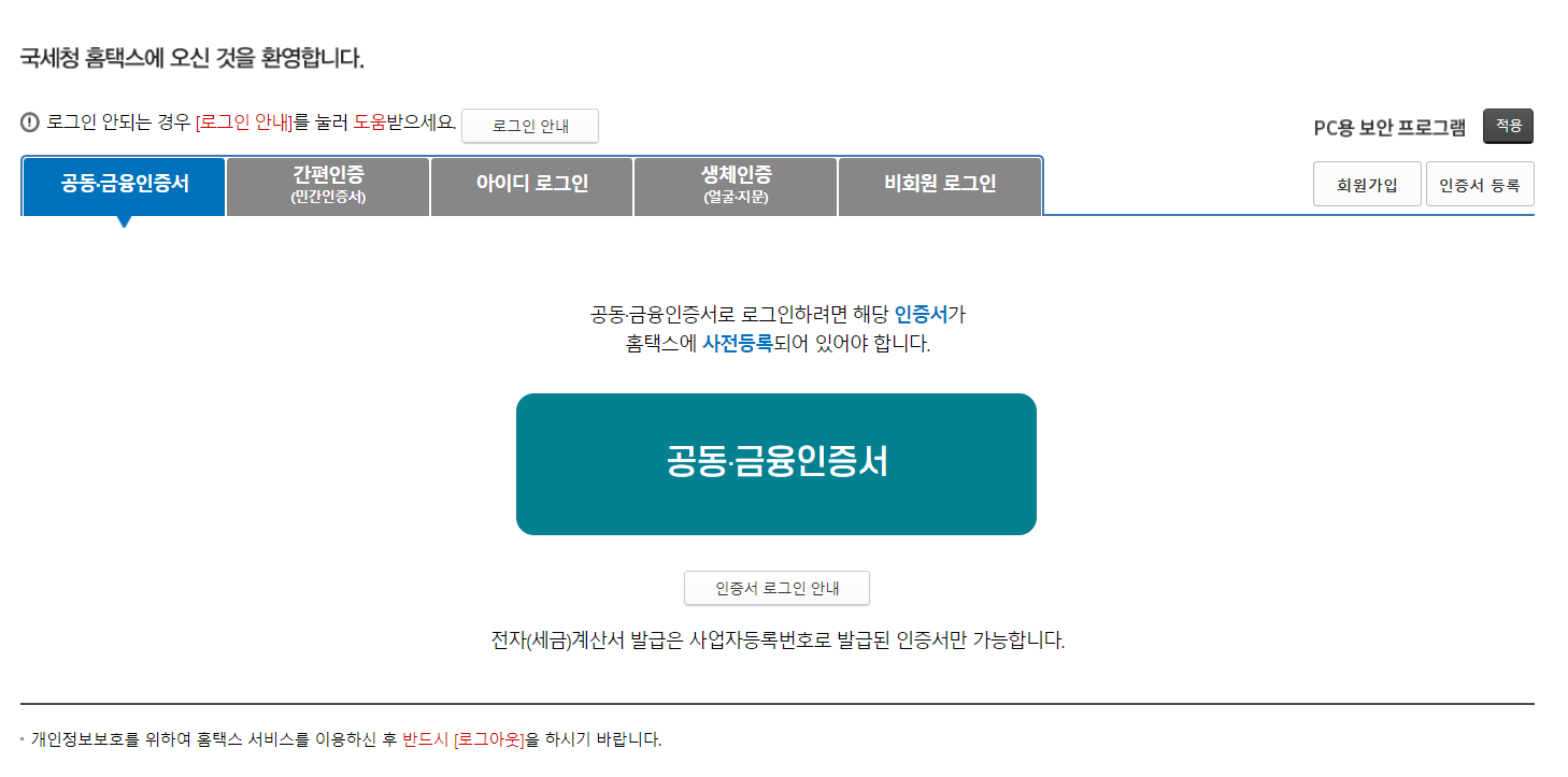 저는 법인이기에 공동인증서를 등록한 후 로그인을 하였습니다.