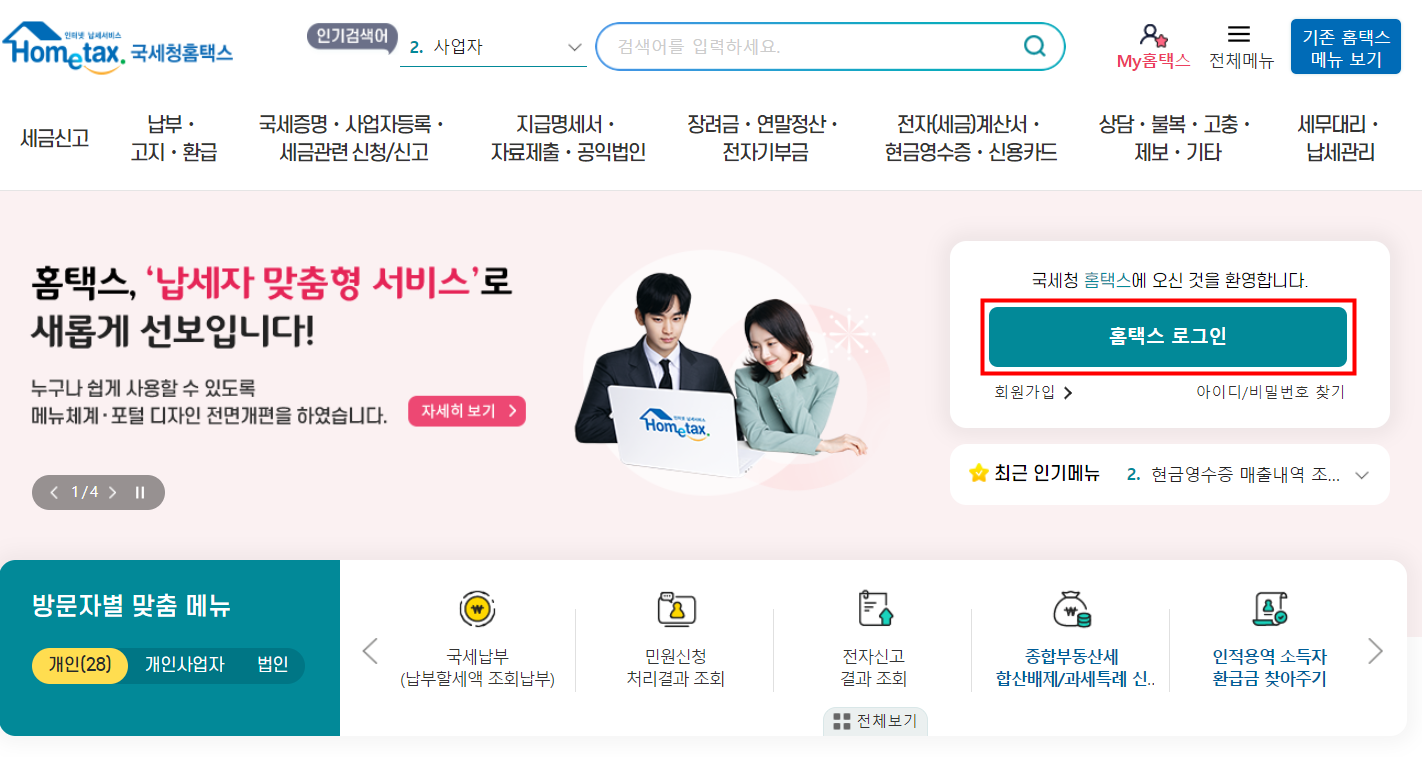 일단 국세청 홈택스에 들어가서 로그인부터 해야합니다.