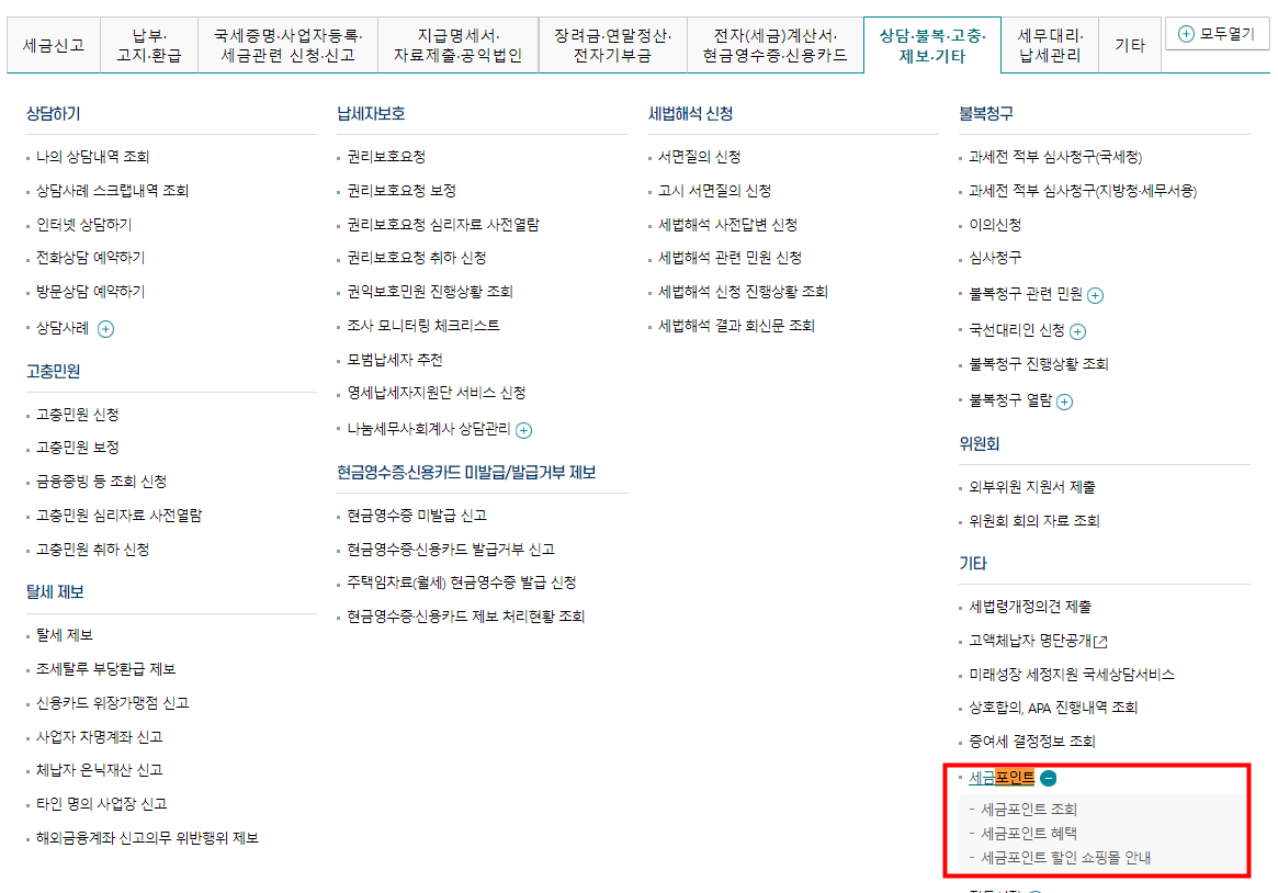 아래 화면처럼 메인에서 상담/불복/고충/제보/기타 > 기타 > 세금포인트 메뉴로 들어가 세금포인트를 조회할 수도 있구요.