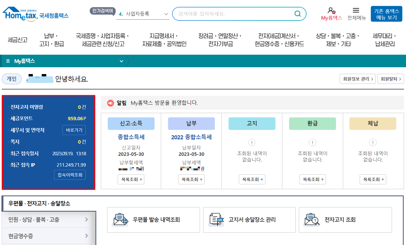 MY홈택스 메뉴에서 한번에 세금포인트 확인