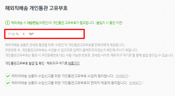 다들 아시겠지만 네이버, 쿠팡 등에서 해외직구 상품을 구입하는 경우 아래와 같이 개인통관 고유부호를 입력하라고 나와있습니다. 이 정보는 관세청 통관을 위해 판매자가 수입시 이를 기재하게 되며, 개인통관고유부호는
