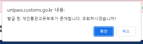 그런데 만약 이미 개인통관고유부호를 발급받은 적이 있다면 아래와 같은 얼럿이 뜨는데요.