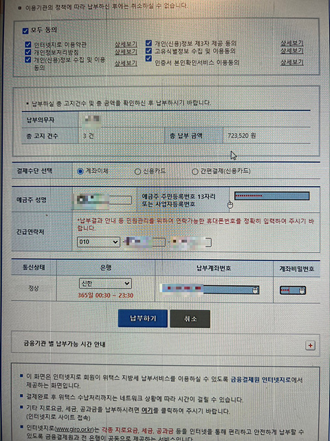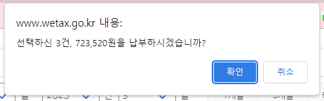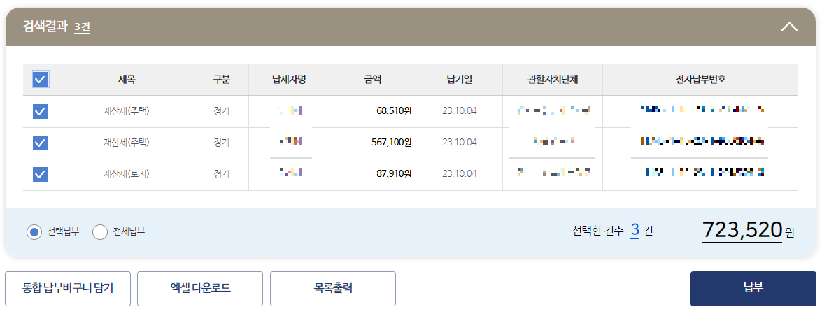 세개를 모두 체크하고 [납부] 버튼을 클릭하면 총액 723,520원을 납부할 수 있습니다.