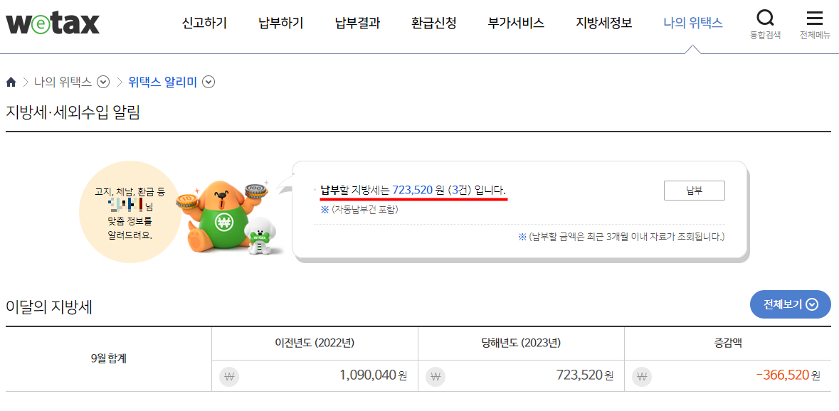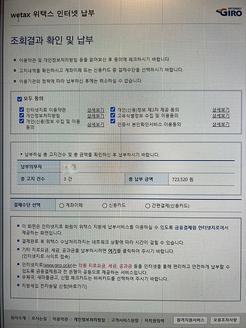와이프는 현재 납부할 지방세가 723,520원이었고, 이는 1개의 아파트 50% 지분과 2개의 오피스텔에 대한 재산세 2기분 총액인데요.