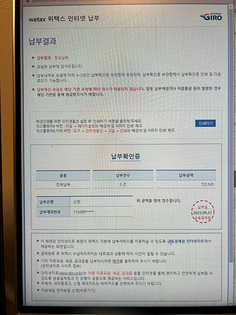그리고 납부가 완료되면 아래와 같이 납부결과가 화면에 나타납니다.