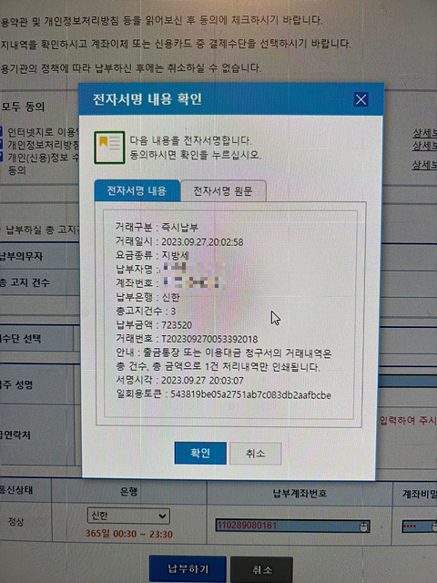 하단에 [납부하기] 버튼을 클릭해 마지막으로 전자서명을 하는데요.