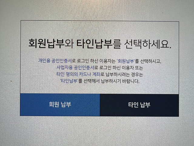 이 때 명의자가 직접 납부하는 [회원 납부]와 [타인 납부]를 선택할 수 있는데요.