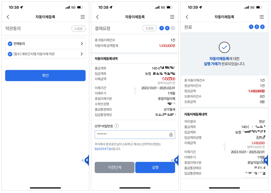 이제 자동이체를 위한 약관동의를 하고 OTP 비밀번호를 입력하면 최종적으로 자동이체등록이 완료가 됩니다.