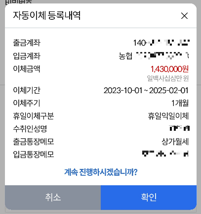 그렇게 모든 사항을 기재하고 [확인] 버튼을 누르면 아래와 같이 자동이체 등록 내역이 상세하게 나옵니다.