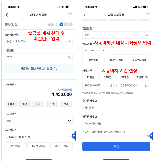 이제 본격적으로 자동이체를 설정할 정보를 넣으면 되는데요.